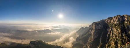 Panoramic view from the West Peak summit of the inspiring, sacred and majestic Huashan mountain, famous tourist attraction, Shaanxi province, China