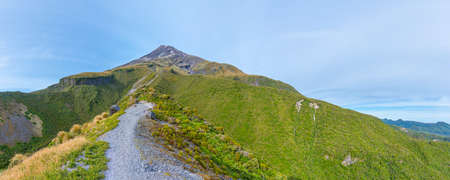 Landscape view of the Taranaki Volcano in the summer. Greenery scene of the mountain in the morning with blue sky.