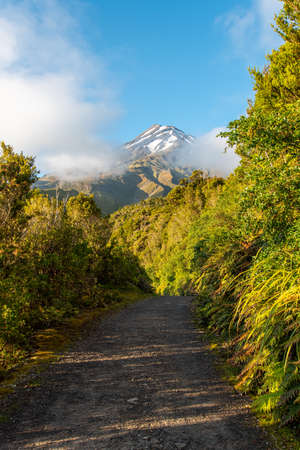 road to a snow capped mount egmont, new zealand