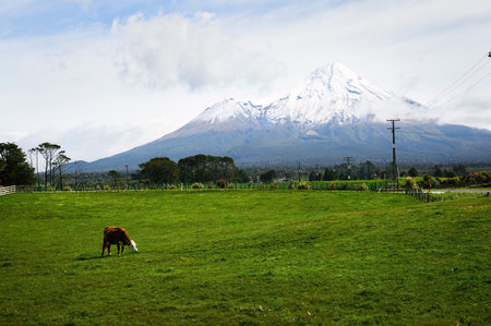 Cattle grazing on the green farmland. Snow-capped Mt Taranaki in the distance. New Plymouth. New Zealand.