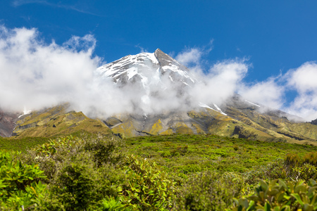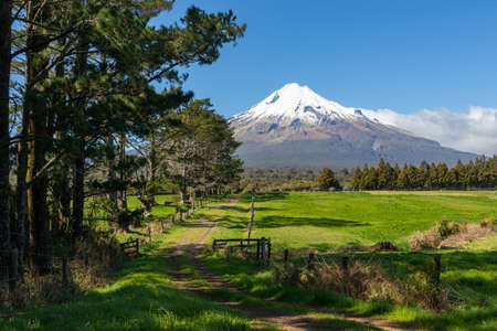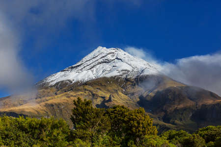 Famous snow capped Mount Taranaki in Egmont National Park, New Zealand