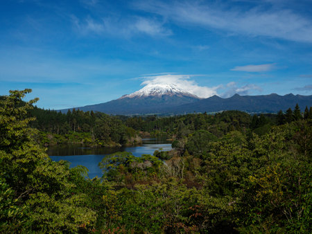 Panoramic view of the iconic snow capped Mount Taranaki Egmont National Park from lush green bush tree forest vegetation at Lake Mangamahoe New Plymouth North Island New Zealand