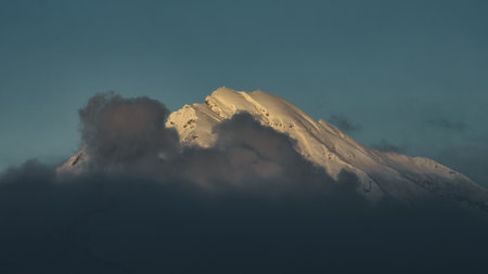 Snowcapped peak of Mount Taranaki in evening light