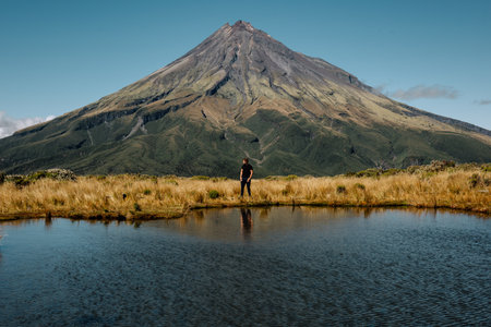 A young male standing near the high mountain and a lake, Egmont National Park North New Zealand