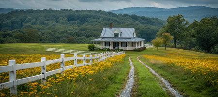 farmhouse surrounded by lush, natural landscape with mountains in the background, created with generative ai