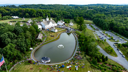 Elizabethtown, Pennsylvania, USA, July 4, 2024 - Charming Rural Fairground With A Scenic Pond, White Barns, Small Churches, And People Enjoying Festivities Amidst Lush Greenery, Creating A Vibrant Community Atmosphere.