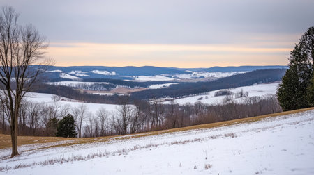 A stunning winter landscape showcasing snow-covered hills and a distant mountain range under soft morning light. Perfect for nature lovers.