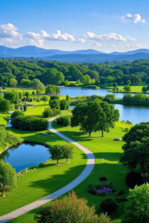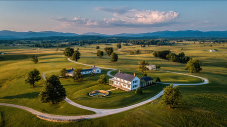 An aerial perspective showcases a large white house and its surrounding grounds. A winding road leads through the green fields and scattered trees. The composition utilizes natural lighting and overhead perspective, creating a scenic view that could be useful for real estate or travel-related purposes.