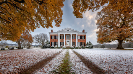 An impressive estate stands amidst a snow-covered field, framed by trees with autumn foliage. The building features classical architectural details and a colonnaded facade. Warm hues of orange and brown contrast with the cool blues and whites of the winter environment. The image evokes a sense of tranquility and could be used for various commercial or editorial purposes.