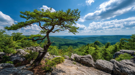 Windswept Pine Tree Overlooking a Forested Mountain Range on a Sunny Day