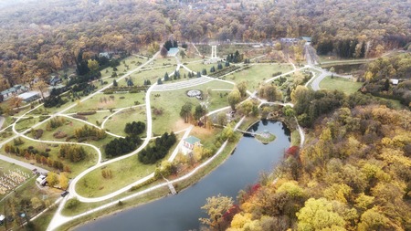 Autumn landscape with lake and colorful trees in park at sunny day