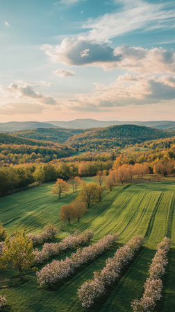 Endless rows of apple trees filled with white blossoms stretch across the landscape, blending beautifully with rolling hills and vibrant greenery under a clear sky.