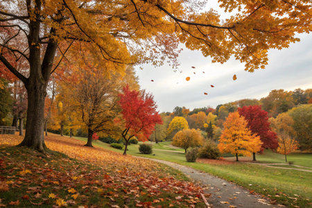 Serene autumn scenery featuring vibrant red, orange, and yellow foliage along a tranquil park path, evoking the crisp air and beauty of the fall season. Ideal for use in travel brochures, seasonal promotions, or nature-themed content.