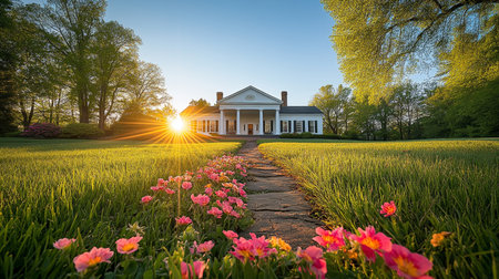 A picturesque country home with sunlight streaming over a flower-lined pathway and surrounded by lush greenery