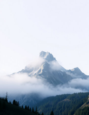 Beautiful alpine mountain landscape with snow covered peaks in the clouds