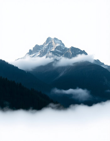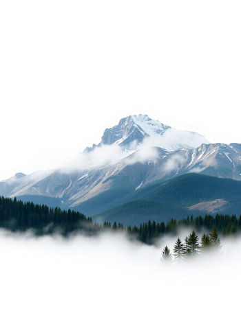 Mountain landscape with snow-capped peaks, clouds and coniferous forest