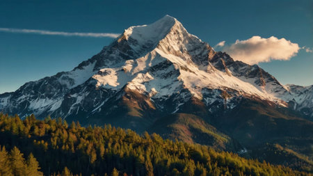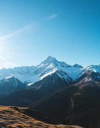 A breathtaking landscape photograph showcases a towering, snow-capped mountain peak