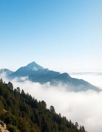 Mountains in the clouds. Snow covered peaks and coniferous forest.