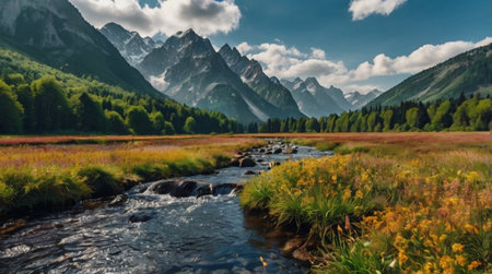 A picturesque mountain valley featuring a flowing river and colorful flowers under a bright sky