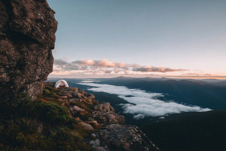 Tent sits on a cliff edge as the sun rises, casting light over mountains and clouds below.