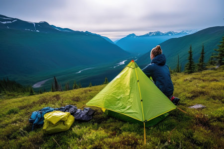 person, using eco-friendly products for camping trip, with view of the wilderness visible in the background, created with generative ai