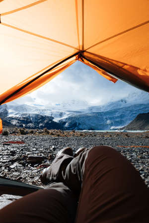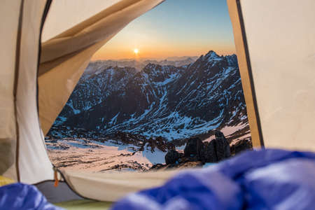 View from tent on snow-capped mountains. Trips and expeditions in the wild. The concept of camping