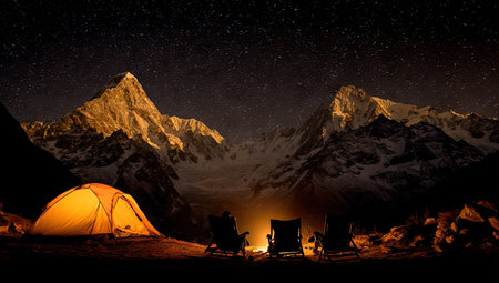 Captivating image of a tranquil camping scene nestled at the base of a majestic mountain peak under a star-studded night sky. Two camping chairs are positioned near a crackling campfire, and a warm-toned tent is visible in the foreground. The overall ambiance is peaceful and serene, showcasing the beauty of nature's grandeur.