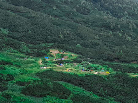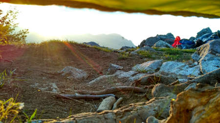 Beautiful view from the tent. Hiking and Tourism. Camping in the mountains. Rest in the wild. Atmospheric photo. Selective focus.