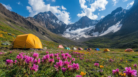 A panoramic view of a campsite on a mountain plateau, with tents scattered among alpine flowers and snow-capped peaks.