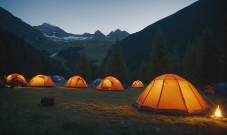 Several tents are lit up at a campsite in the mountains at dusk