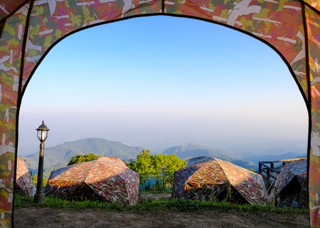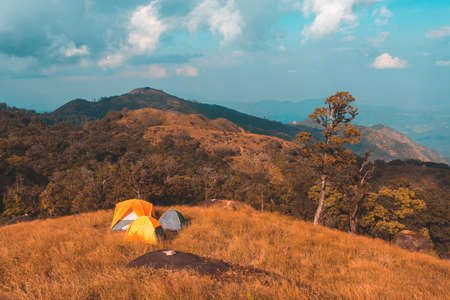Yellow tent on the mountain and sunset view,Doi Luang