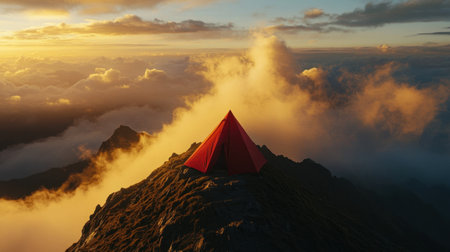A vibrant camping tent sits atop a majestic mountain peak during a stunning sunset. Surrounded by fluffy clouds, the scene captures the beauty of nature and adventure.