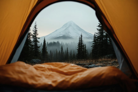 From inside a warm tent, a stunning vista unfolds as a snow-capped mountain rises majestically above a misty forest. The golden hues of the sleeping bag contrast with the serene greenery of nature, evoking a sense of tranquility.