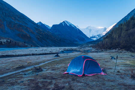 camping place. Tent in the frosty morning with Belukha Mountain view from the Akkem lake. mountain valley. Altai Mountains