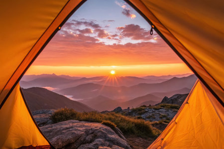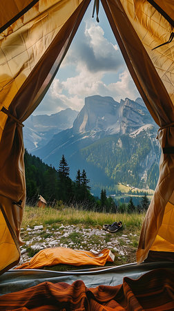 Generative AI : POV view of hipster tourist inside tent in front of mountains landscape Adventure hiking and wanderlust concept