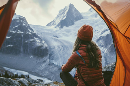 Back view of woman hiker sitting in tent and looking at snowcapped mountains.