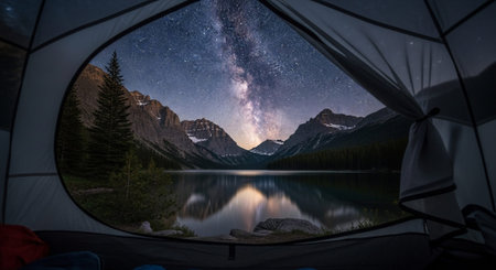 tent in the mountains with night sky and milky way.