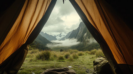 Framed by a tent's entrance, a view of misty mountains and a lush green valley, capturing the natural beauty of an untouched wilderness.
