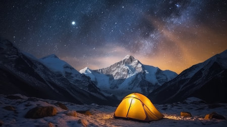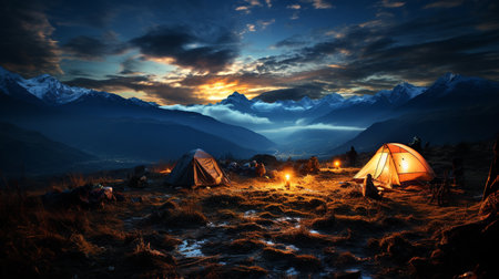 Moonlit mountains embrace serene tourist camp with cozy tent under mesmerizing starry sky