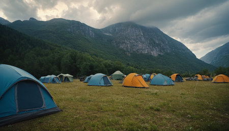 Camping in the mountains in the summer on a cloudy day.