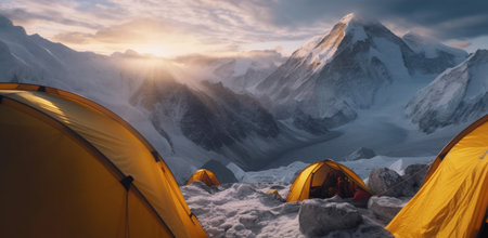 Camping in the Everest mountains during sunrise