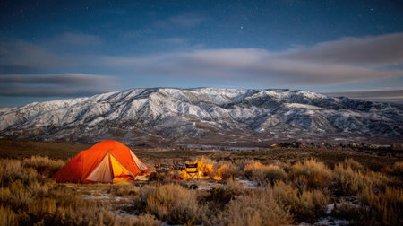 An illuminated orange camping tent sits in a field beneath a night sky with a backdrop of a snow-covered mountain range. The scene features a bonfire casting warm light and shadows. The composition suggests an outdoor adventure with potential uses for travel, recreation, or nature-related projects.