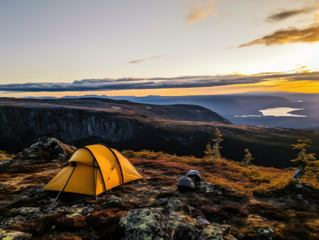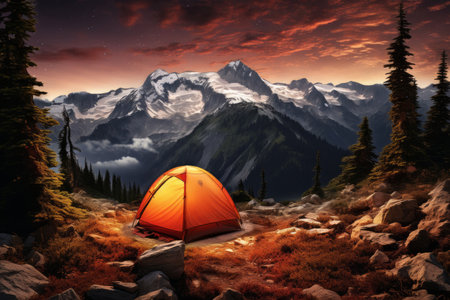 beautiful mountainside camping spot with a tent, created with generative ai