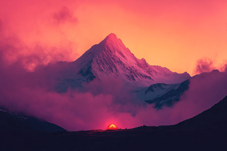 A monochromatic silhouette of a tall, snow-covered mountain against a vibrant pink-orange sunset. Below is a small minimalist camping site with a single glowing tent, surrounded by misty clouds