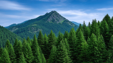 Mountain landscape panorama with coniferous trees and blue sky