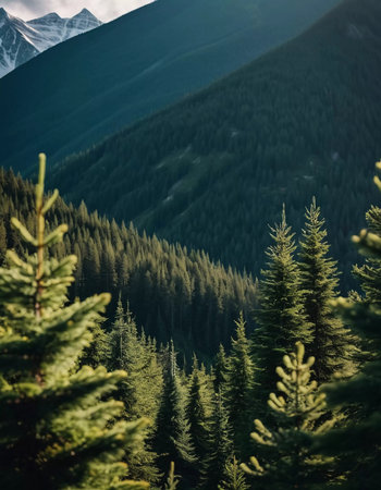 Mountain landscape with fir trees and snow-capped mountains.