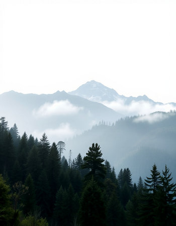 Explore a breathtaking forest landscape where majestic mountains meet lush evergreen trees, shrouded in mist, creating an atmosphere of serene tranquility.