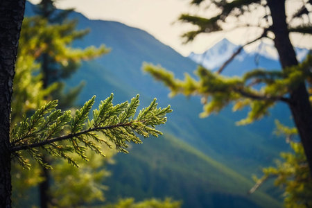 Pine tree on the background of mountains and blue sky in summer