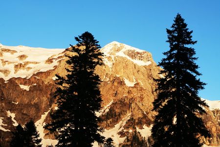 Mountain landscape with fir trees and snow covered peaks at sunset.