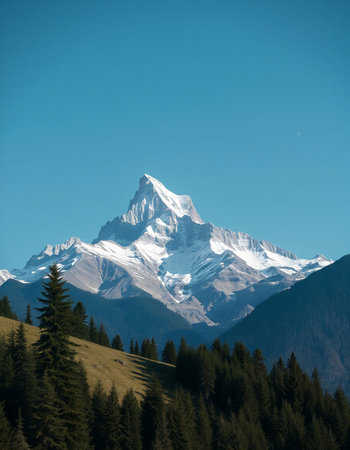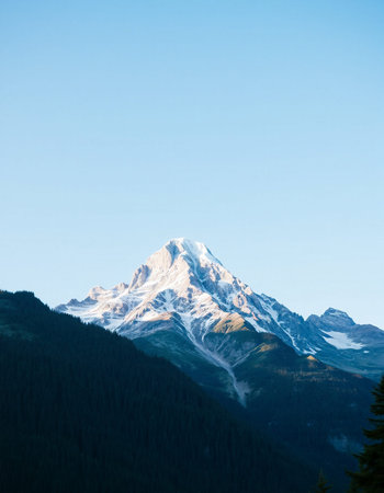 Discover an awe-inspiring view of majestic snow-capped mountains surrounded by lush green trees in a serene wilderness landscape.